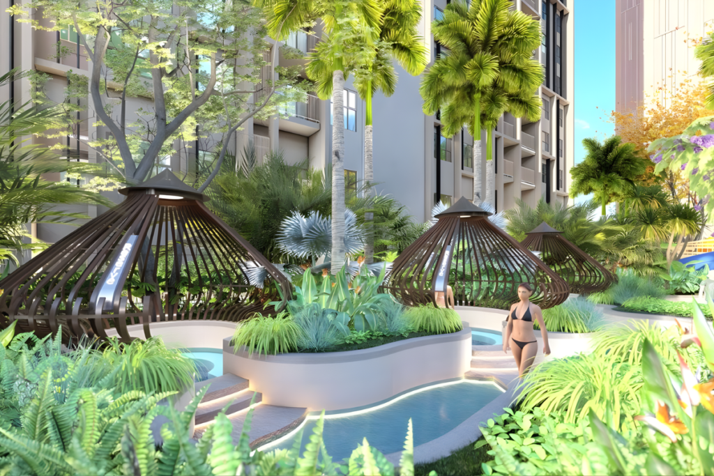 Không gian nghỉ tĩnh được bố trí hài hòa giữa cảnh quan xanh và mặt nước, mang đến cảm giác thư giãn đặc trưng của mô hình tropical resort. Hệ chòi nghỉ và võng thư giãn không chỉ tạo điểm nhấn cảnh quan mà còn là nơi lý tưởng để đọc sách, nghỉ trưa hay thiền nhẹ. Khác với các tiện ích chỉ mang tính trang trí, khu vực này được thiết kế để cư dân thực sự sử dụng và tận hưởng trong đời sống hằng ngày.