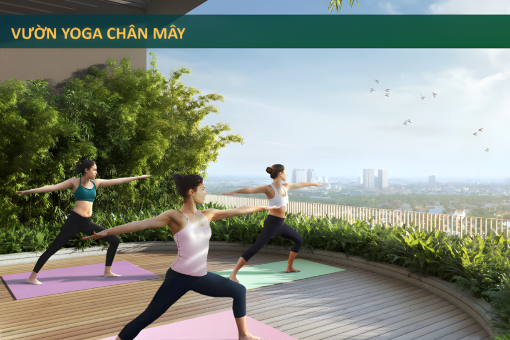 Vườn yoga được bố trí tại tầng cao, mang đến tầm nhìn thoáng đãng và sự riêng tư cần thiết cho các hoạt động rèn luyện nhẹ nhàng. Không gian này phù hợp cho yoga, thiền, stretching và những hình thức vận động chậm, giúp cư dân thả lỏng cơ thể và tinh thần sau nhịp sống bận rộn.