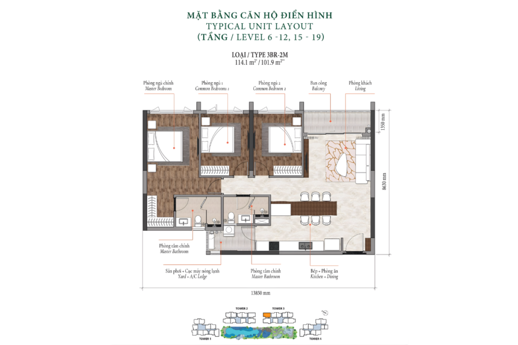| Tiêu chí | Căn hộ 3PN 1 phòng chính (Tháp 1) | Căn hộ 3PN 2 phòng chính (Tháp 3) |